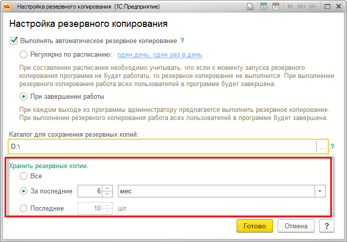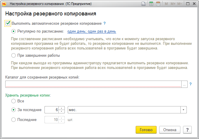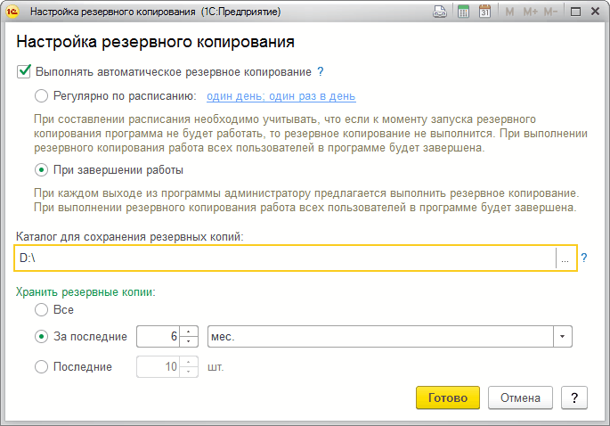 В программе 1С есть настройка автоматического резервного копирования. При этой настройке пользователю не придётся заботиться о том, чтобы сохранить свои данные. Программа сделает это за него.