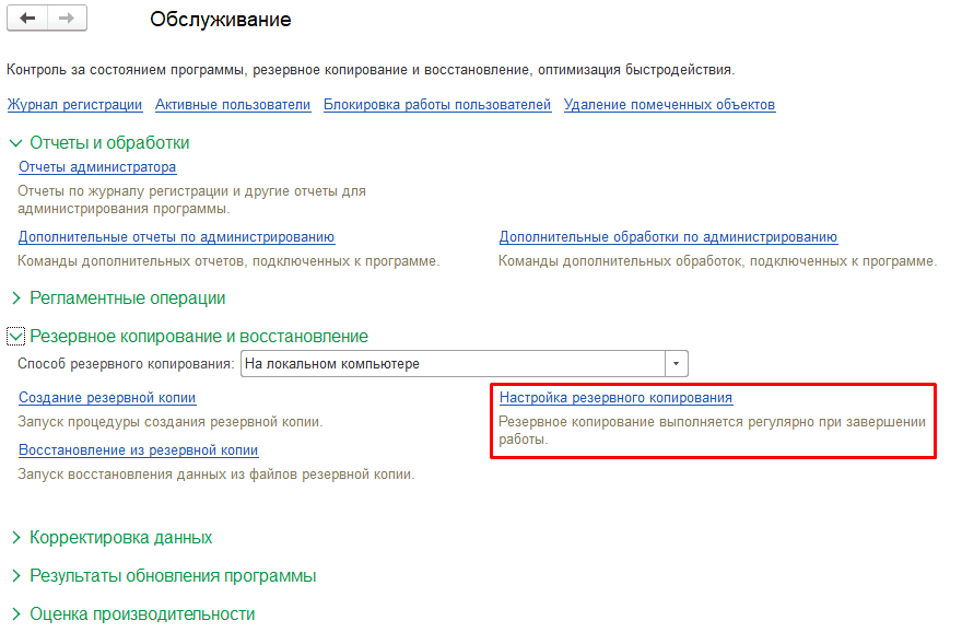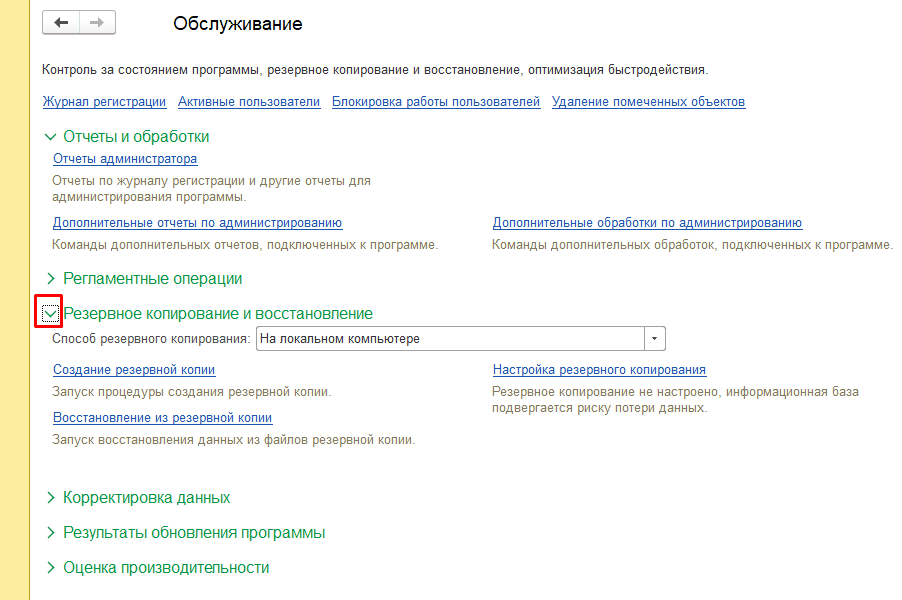 По ссылке «Создание резервной копии» можно сразу сделать копию. По ссылке «Восстановление из резервной копии» – восстановить базу из копии.