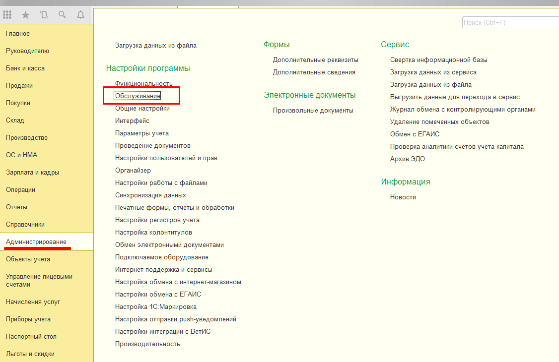 1. Зайти в меню: Администрирование – Настройки программы – Обслуживание.