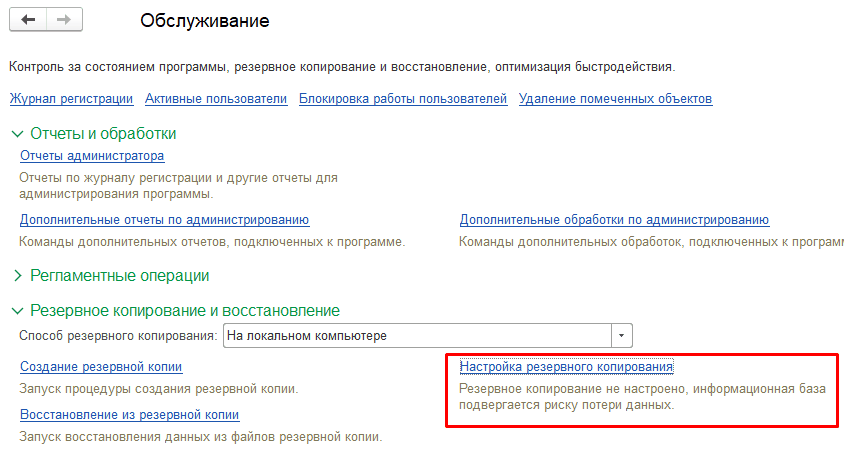 3. Под гиперссылкой «Настройка резервного копирования» указано, настроено ли копирование в данном программном продукте. У нас оно пока не настроено.